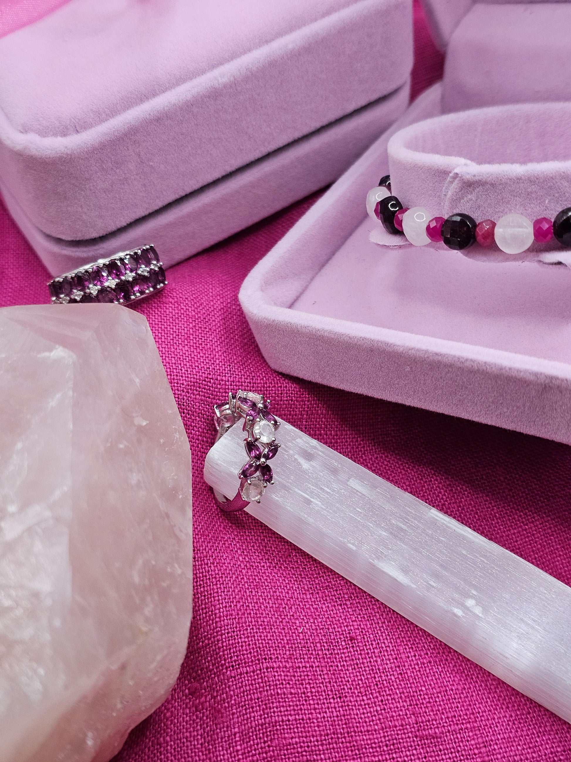 Featuring Rhodolite Garnets and Rose Quartz, this sterling silver ring will help you balance vitality and passion with self love all year long!